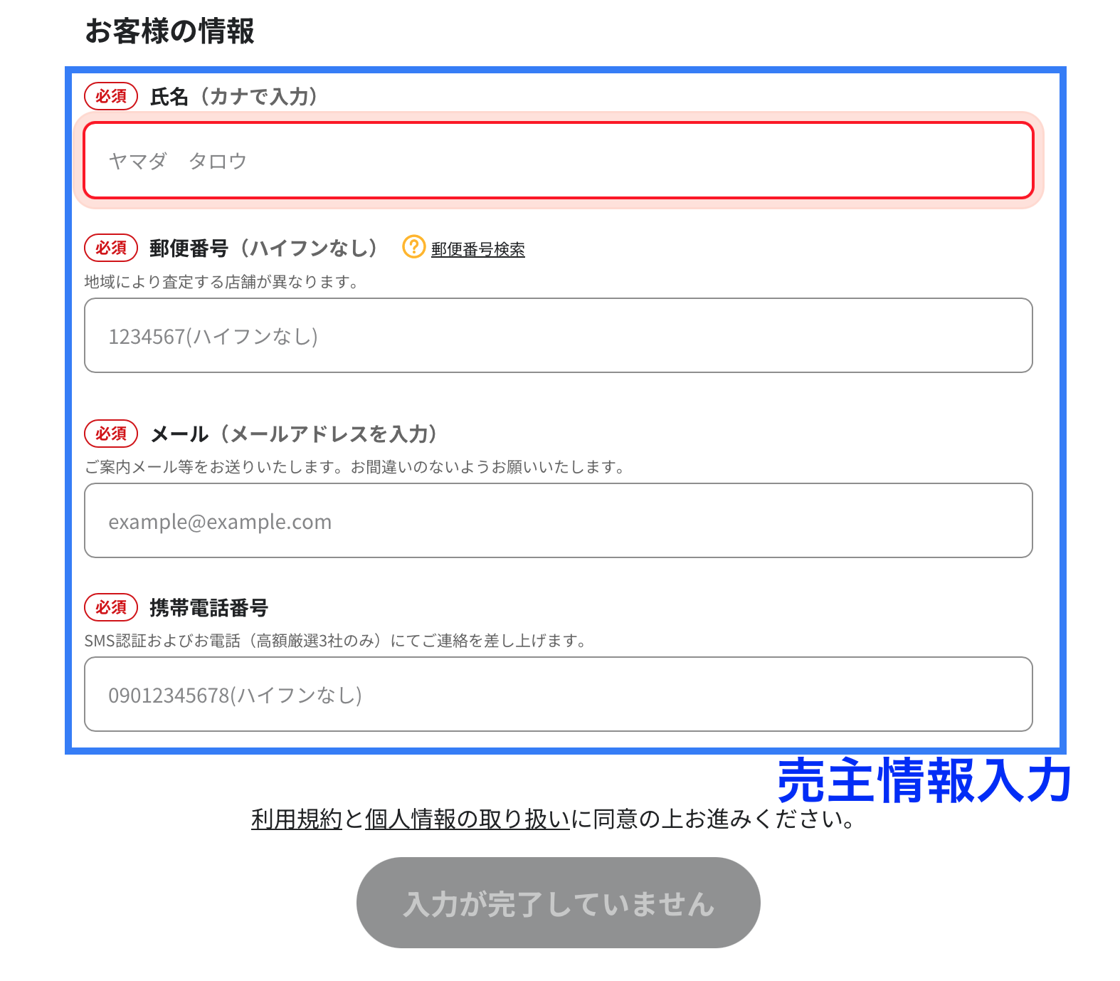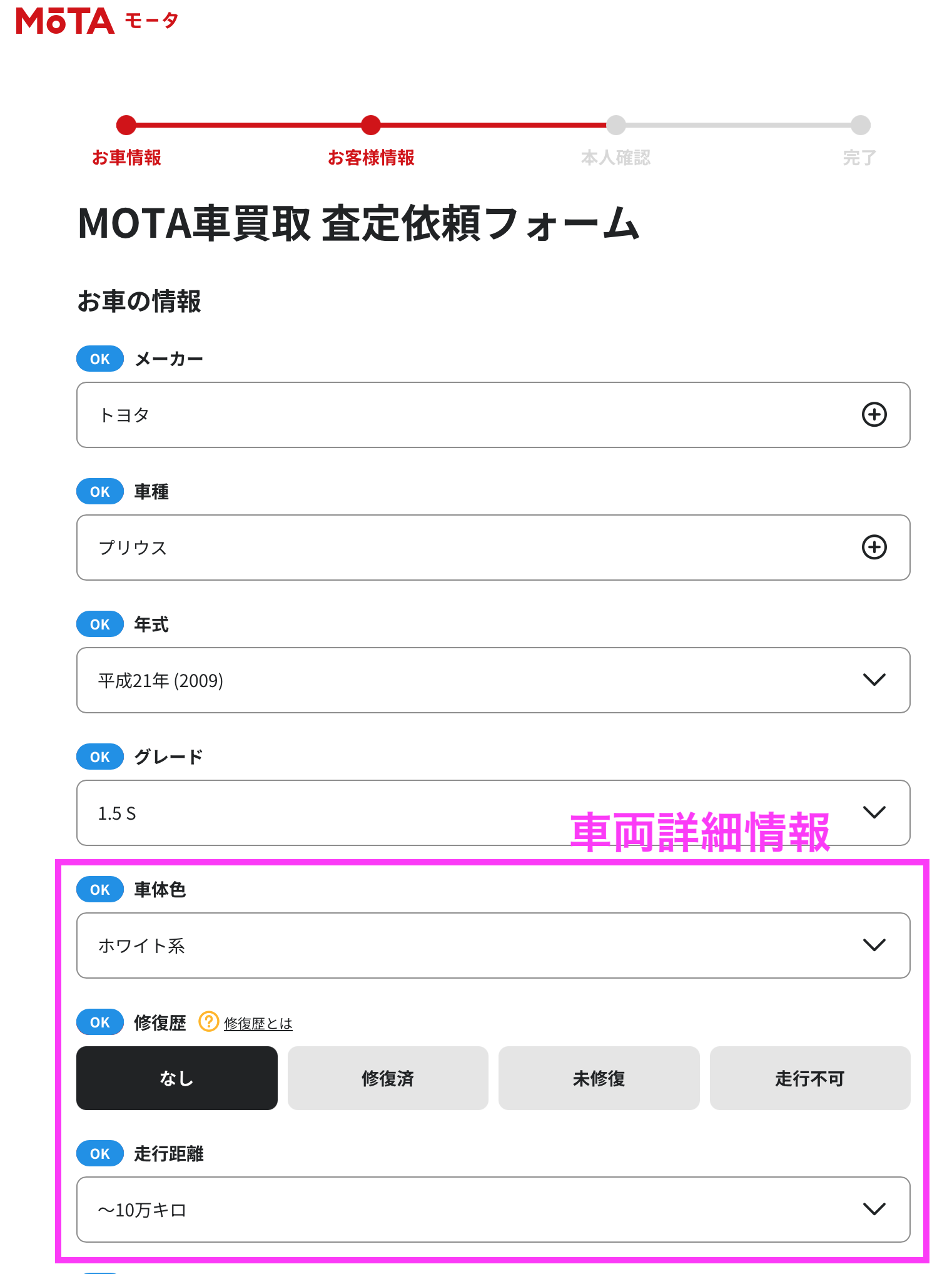 車体色や走行距離情報などを埋め、自分の情報も入力します。